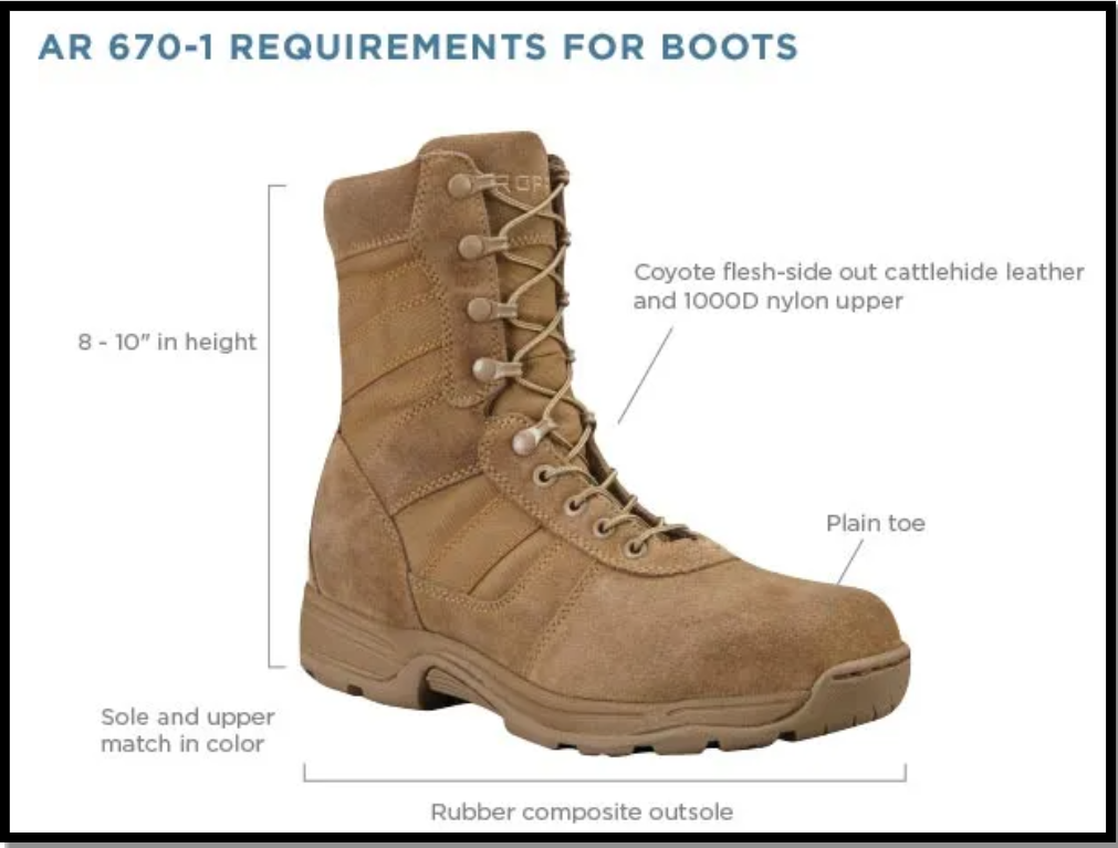 It is important to select a proper pair of boots to avoid blisters and maximize performance. Boots must be advertised as "AR 670-1 Compliant" to be worn while in military uniform.