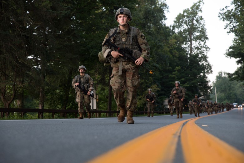 A routine part of military operations is moving from one location to another while carrying a load. As such, new cadets are introduced to weighted foot marches (“ruck marches”) during CBT. Cadets will conduct foot marches three to five times over the summer across varying distances, culminating with a 12-mile foot march from Lake Frederick to West Point while carrying 45 pounds of equipment.