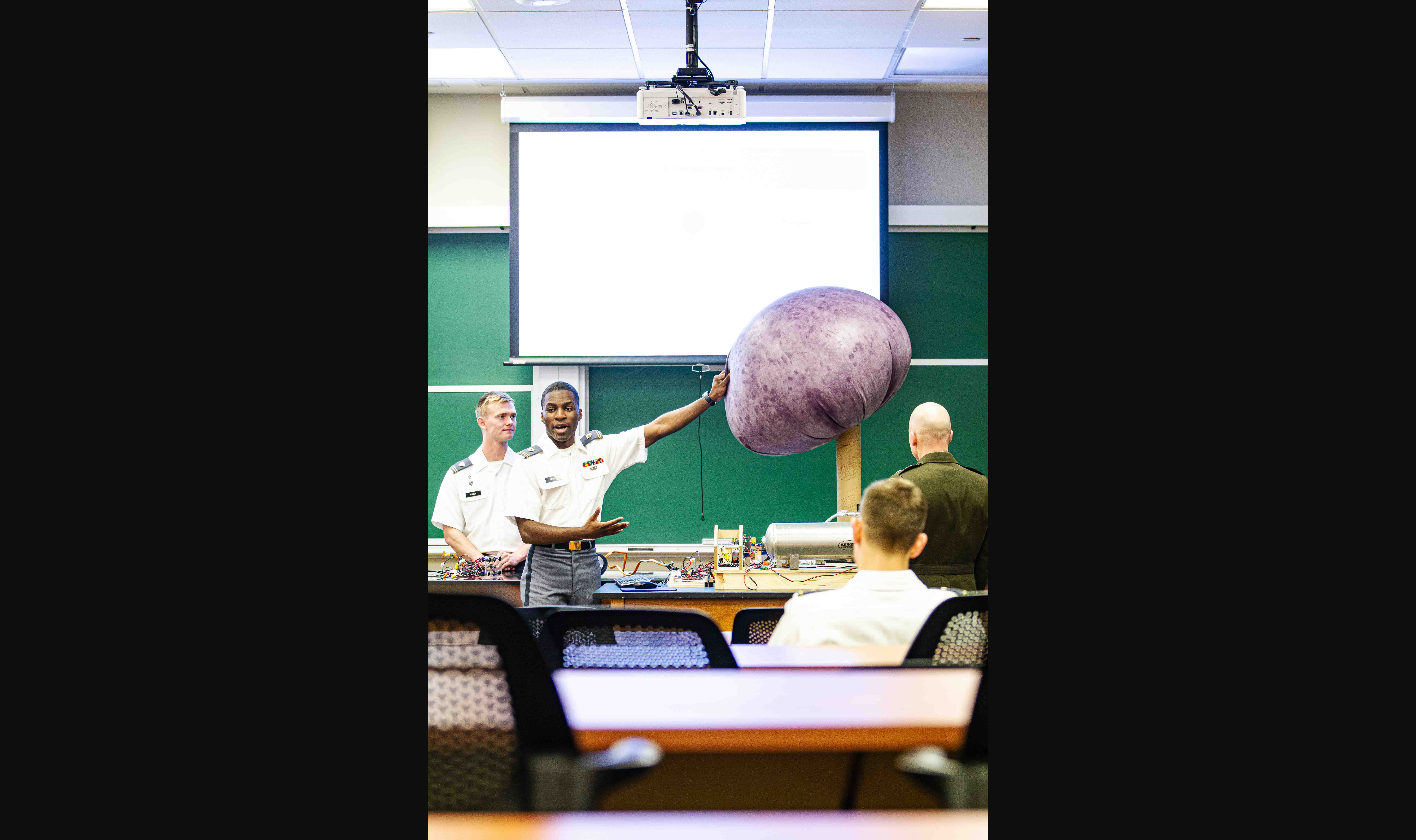 Class of 2024 Cadets Raymond Triggs and Paul Bruce took on the responsibility of advancing the Army's mission when they teamed up with Class of 2026 Cadets Qinglang Lao, Michael Speer, Spencer Stovall and Reid Wesley on developing the "High-Altitude Balloon Closed-Loop System.