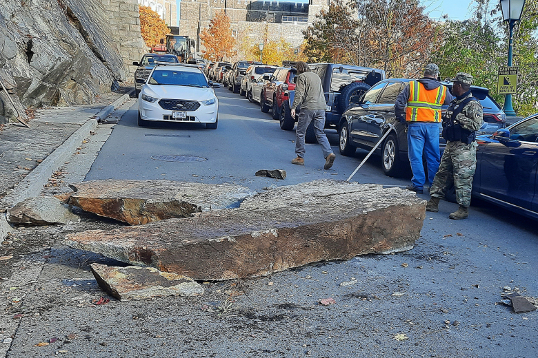 On Tuesday morning, a slab of rock along the rock wall on Williams Road, the road behind Taylor and Mahan Halls near the train station at South Dock, fell into the road....
