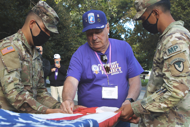 Robert Sodergren, a purple heart recipient and Vietnam veteran, assists members of the West Point Military Police Honor Guard in folding the American flag during a retreat ceremony Sept. 30 at the flag pole on Trophy Point. The U.S. Military Academy hosted members of the National Purple Heart Honor Mission #2 as part of an effort to bring attention to combat wounded veterans and their families. ...