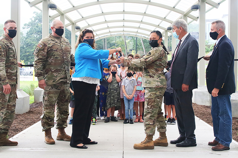 Above from left to right) U.S. Army Corps of Engineers Commander and District Engineer, New York District Col. Matthew Luzzatto, U.S. Army Garrison West Point Command Sgt. Maj. Rusty Lane, Department of Defense Education Activity Americas Director of Student Excellence Dr. Judith Minor, U.S. Army Garrison West Point Commander Col. Evangeline Rosel, DODEA Director Tom Brady and West Point Elementary School Project Engineer Tim Pillsworth cut the ribbon during the West Point Elementary School Ribbon Cutting ceremony Sept. 1 at West Point. ...