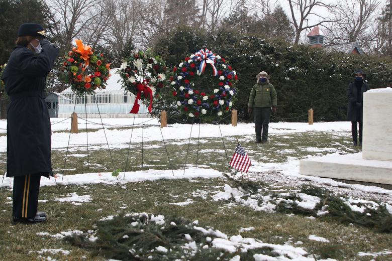 U.S. Military Academy Dean of the Academic Board Brig. Gen. Cindy Jebb salutes former President Franklin D. Roosevelt’s grave during the commemoration of FDR’s 139th birthday Jan. 29 in Hyde Park, N.Y. The wreath laying ceremony is an annual event that takes place in the rose garden at the Franklin D. Roosevelt Presidential Library and Museum. However, the celebration was scaled down this year due to the pandemic. FDR entered the presidency at the height of the great depression and led the country during World War II. Roosevelt was president from 1933-45 and died during his unprecedented fourth term in office. ...